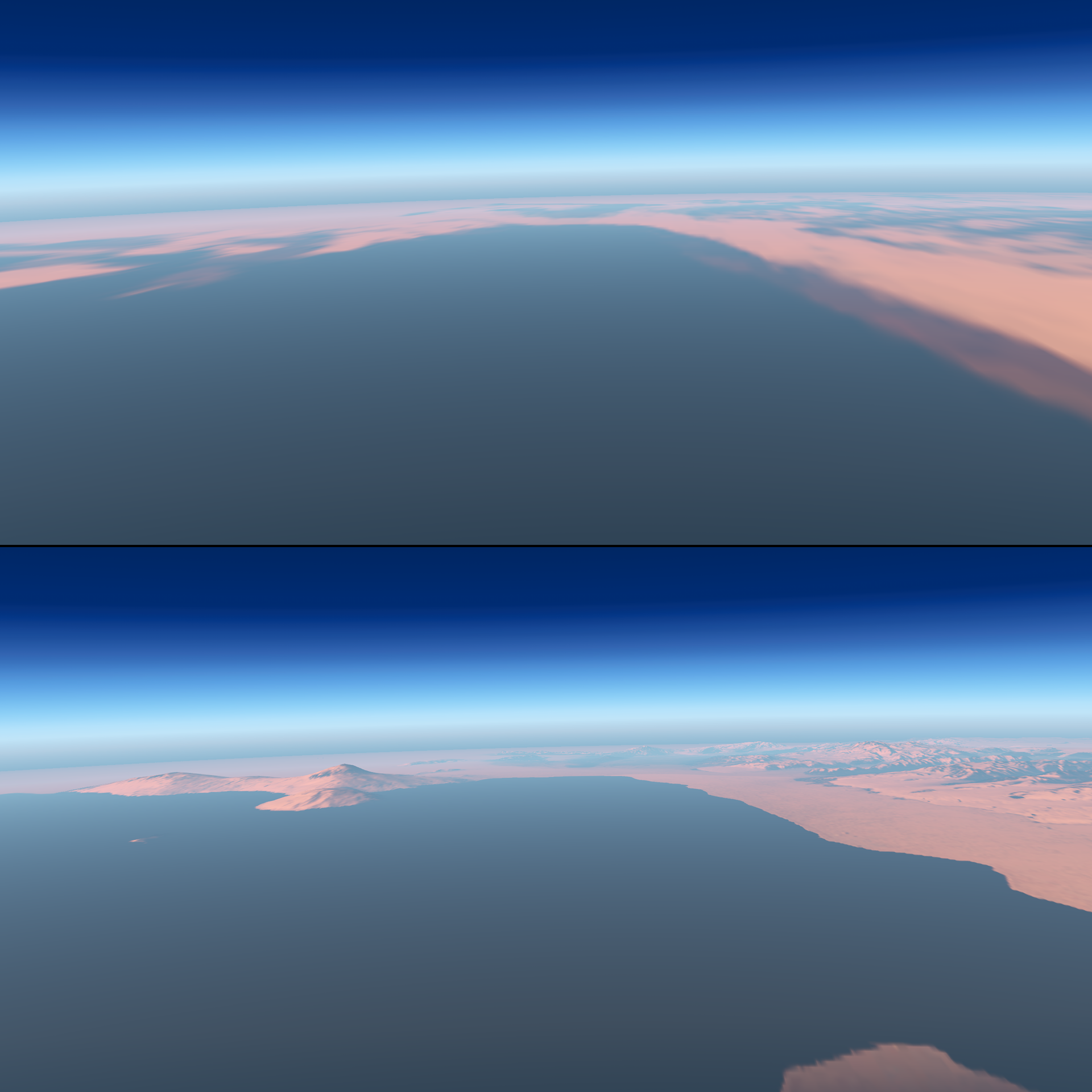 Some background information: The X-Plane landscape is tiled into 1×1 degree tiles. Such a tile has at the equator a width of about 111 km and at McMurdo Station, a X-Plane tile has a width of only 25 km. X-Plane loads 4*3 tiles and draws outside this area a low resolution mesh, encoded in the “Earth Orbit Textures”. Which results in a, more or less, nice virtual horizon. But these “Earth Orbit Textures” are missing for Antarctica. And on these I’m currently working on: