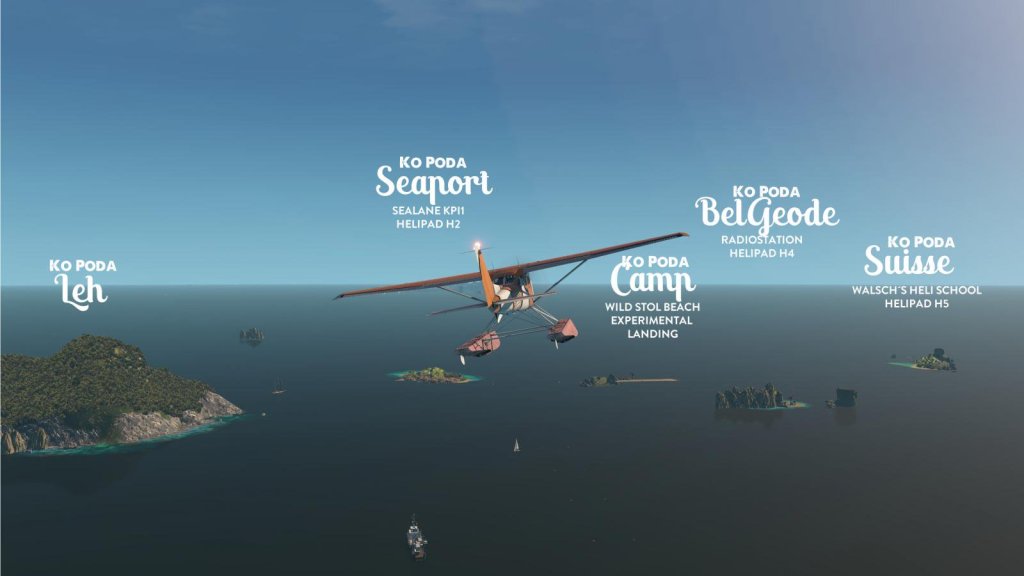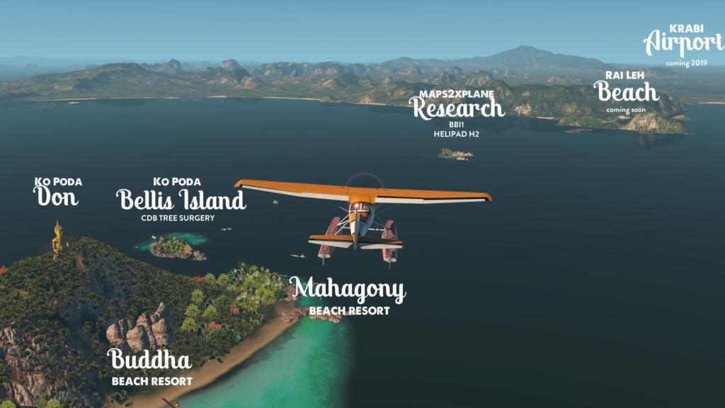 Stefan’s semi-fictive Poda Group Island scenery package for X-Plane including a custom terrain mesh by Maps2XPlane is available at x-plane.org. (Note: Stefan’s scenery seems offline at the moment; I’ve tried to reach him, so far without success; I’ll let you know if I have any news)