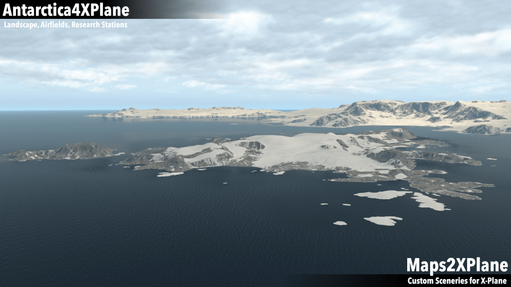 Part 1 of Antarctica4XPlane covers the South Orkney Islands and the Antarctic Peninsula down to -76 degrees. In addition to my terrain mesh I suggest to you my Signy Research Station and my Port Lockroy Base scenery.